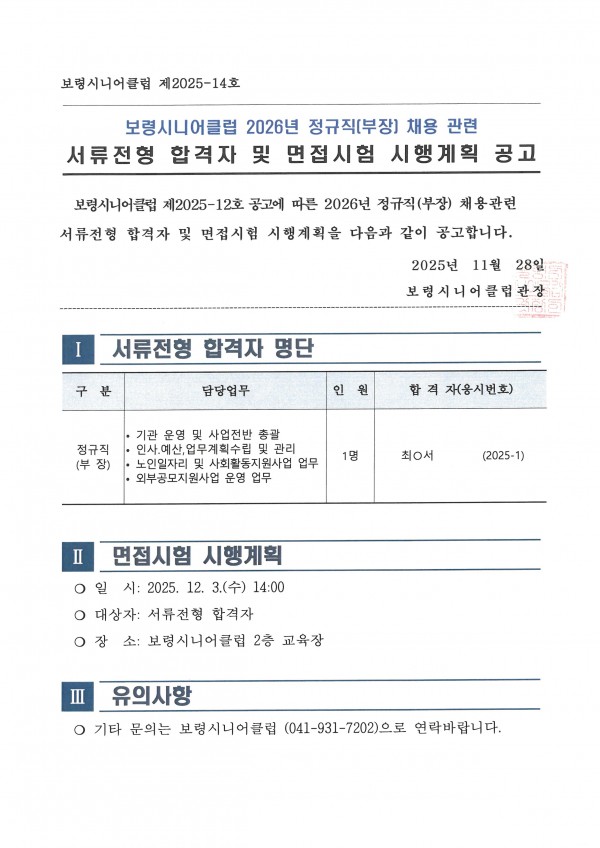 2026년 정규직(부장) 채용 관련 서류합격자 및 면접심사 시행계획 공고